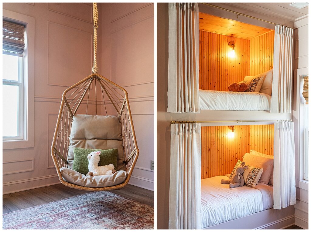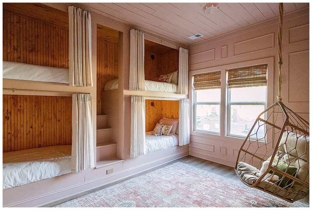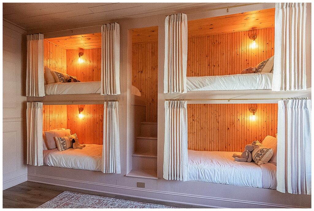Four built-in, adult-sized bunks line the wall, each thoughtfully framed to feel architectural rather than added on. Warm wood interiors bring depth and texture, while soft linen curtains allow each sleeping space to be closed off for privacy. Individual reading lights give every bunk its own sense of autonomy, making the room as functional for adults as it is magical for children.